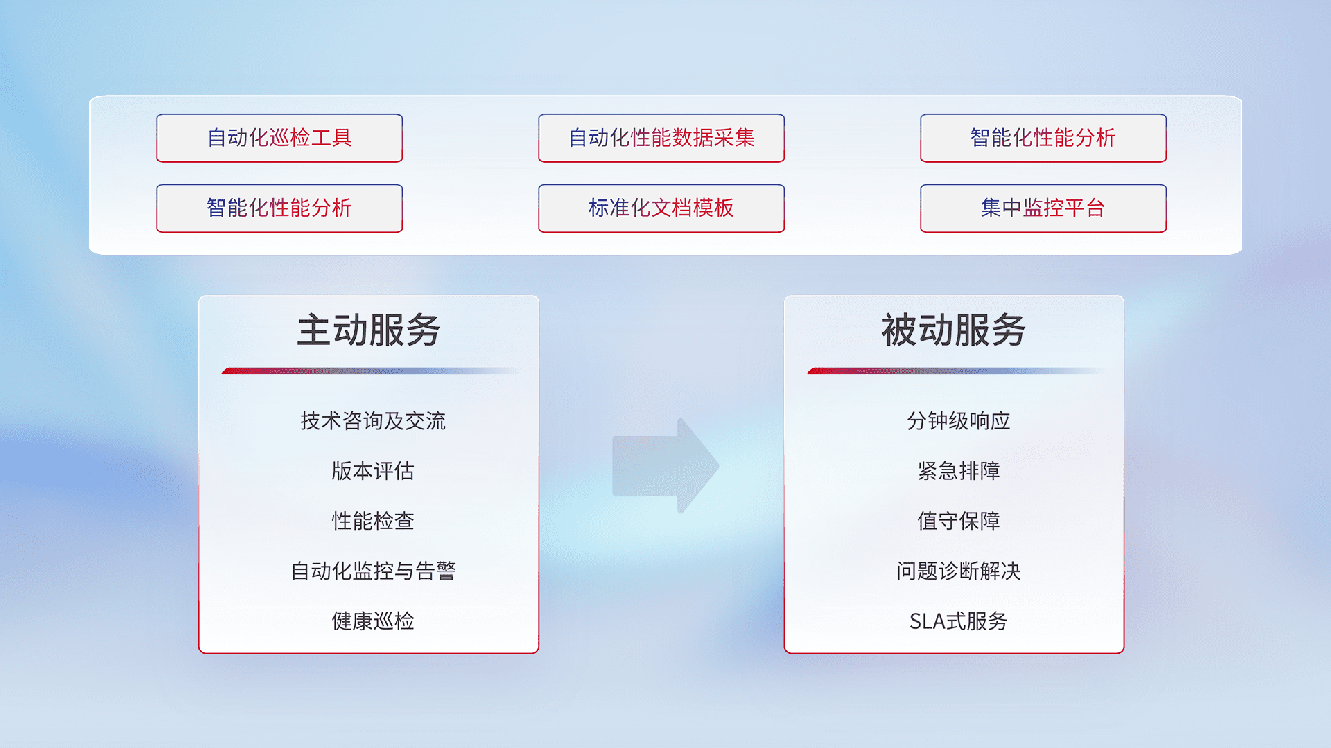 智能化工具和标准化文档,,保障服务质量,,,,提供主动服务(包含技术咨询、、、、版本评估、、性能检查、、、自动化监控与告警、、、、健康巡检)和被动服务包含(分钟级响应、、、紧急排障、、值守保障、、、问题诊断解决、、SLA服务)。。